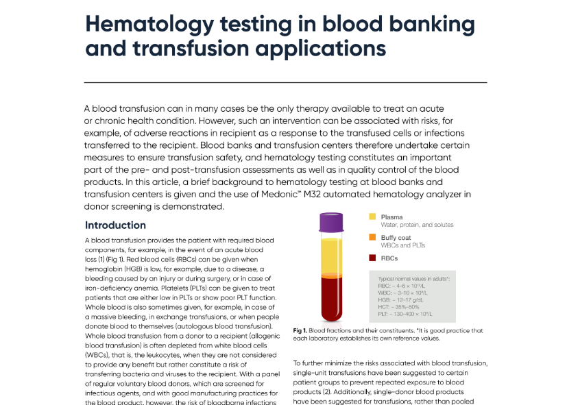 Sa svojim kompaktnim dizajnom, vrlo preciznim rezultatima, te minimalnim potrebama za održavanjem, Medonic M32 pruža laboratorijima učinkovit alat za hematološku analizu. Nadalje, inovativni koncept uzorkovanja i uzimanja kapilarne krvi iz prsta smješta ga i u ambulante pored samog pacijenta.